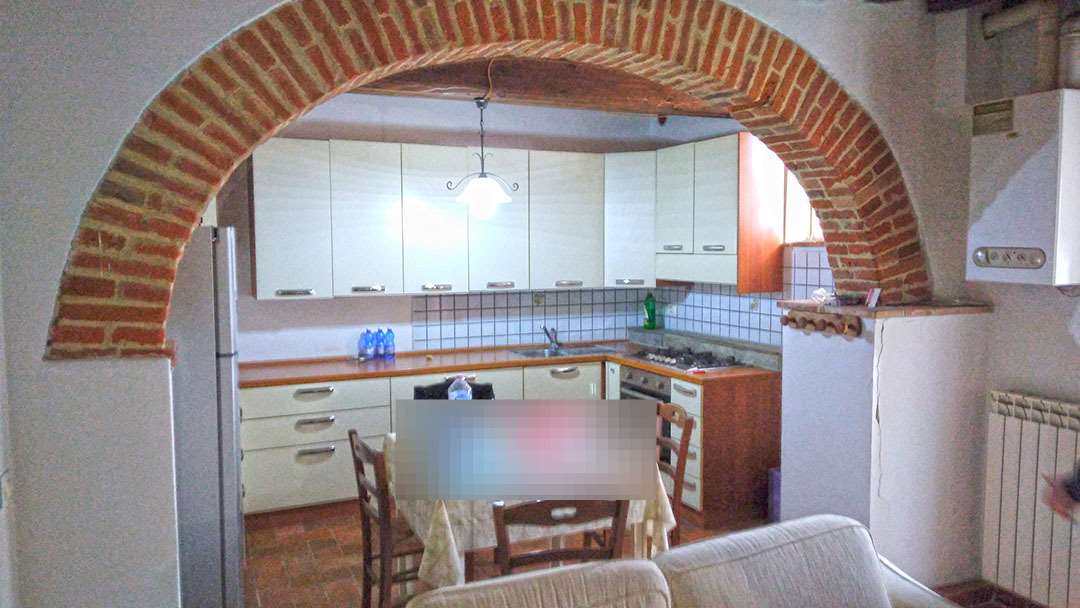 cucina-pranzo-soggiorno, con arco centrale che funge da elemento di separazione degli ambienti