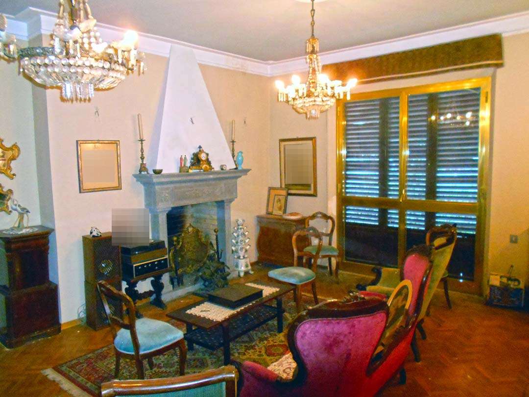 L’immobile è composto da: ingresso, cucina, terrazzo, locale pluriuso, studio, soggiorno con camino (e accesso a un altro terrazzo), disimpegno, stireria, tre camere da letto, due bagni, salone, sala da pranzo con camino e una seconda cucina con ripostiglio.